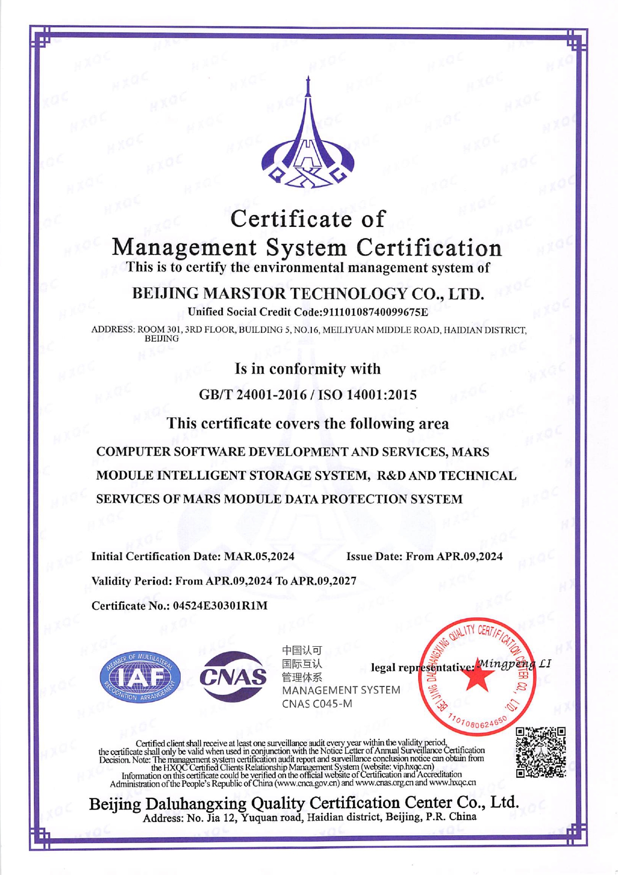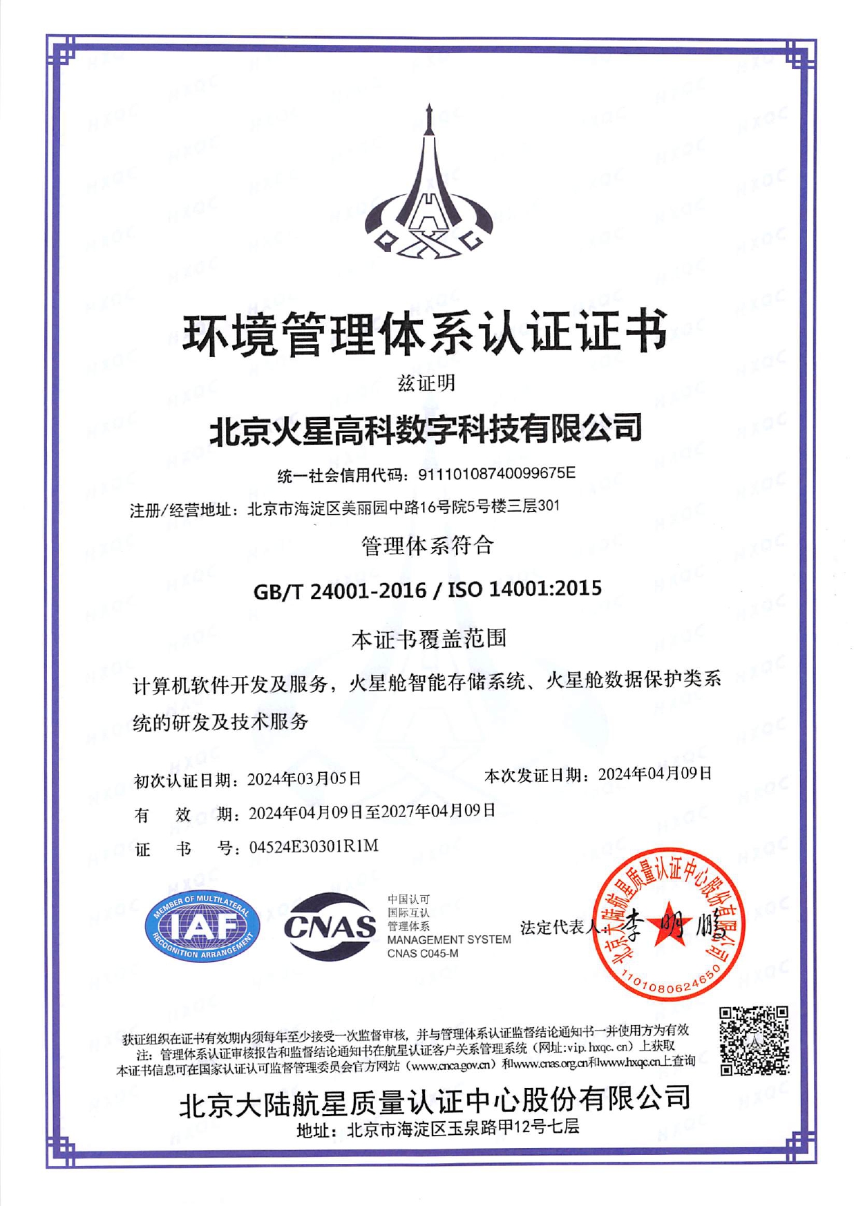 2024環(huán)境管理體系認證證書(中英)-14001